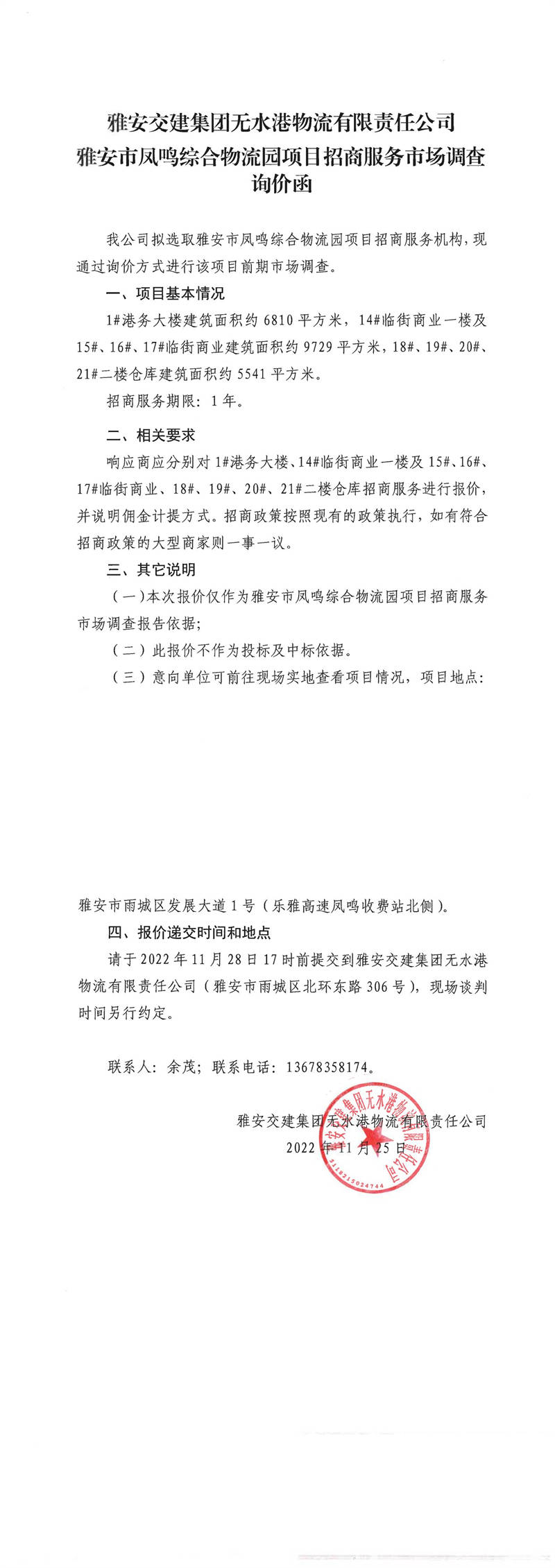 雅安交建集團無水港物流有限責任公司雅安市鳳鳴綜合物流園項目招商服務市場調查詢價函