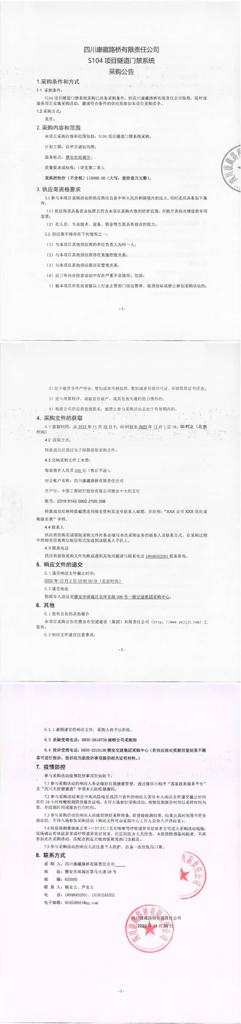四川康藏路橋有限責(zé)任公司S104項(xiàng)目隧道門(mén)禁系統(tǒng)采購(gòu)公告