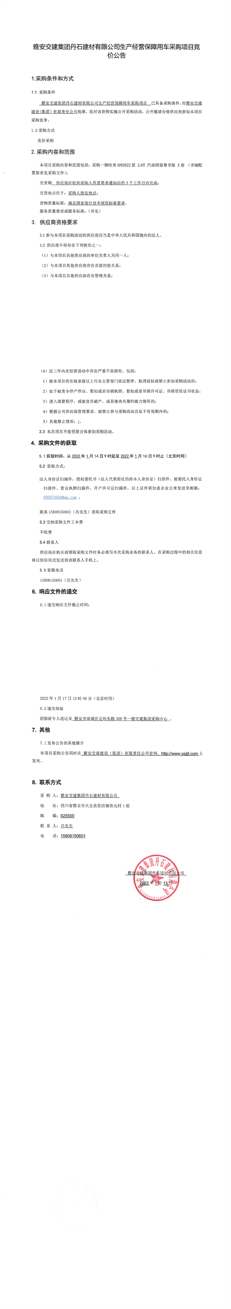 雅安交建集團(tuán)丹石建材有限公司生產(chǎn)經(jīng)營保障用車采購項(xiàng)目競價公告