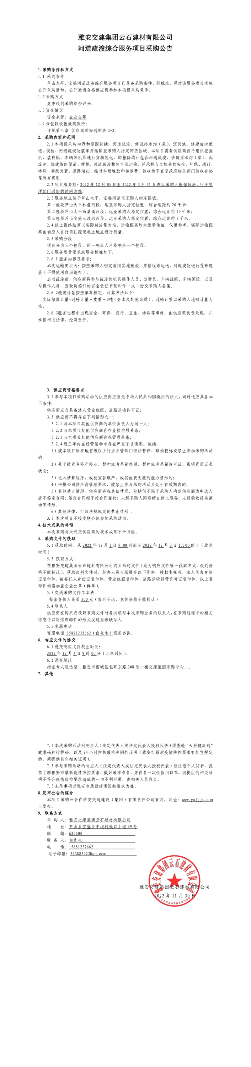雅安交建集團云石建材有限公司河道疏浚綜合服務(wù)項目采購公告