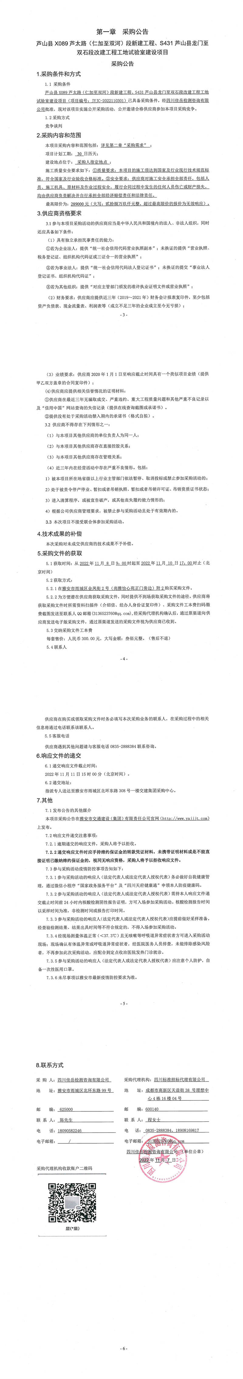 四川佳岳檢測咨詢有限公司蘆山縣X089蘆太路(仁加至雙河)段新建工程、S431蘆山縣龍門至雙石段改建工程工地試驗室建設項目采購公告