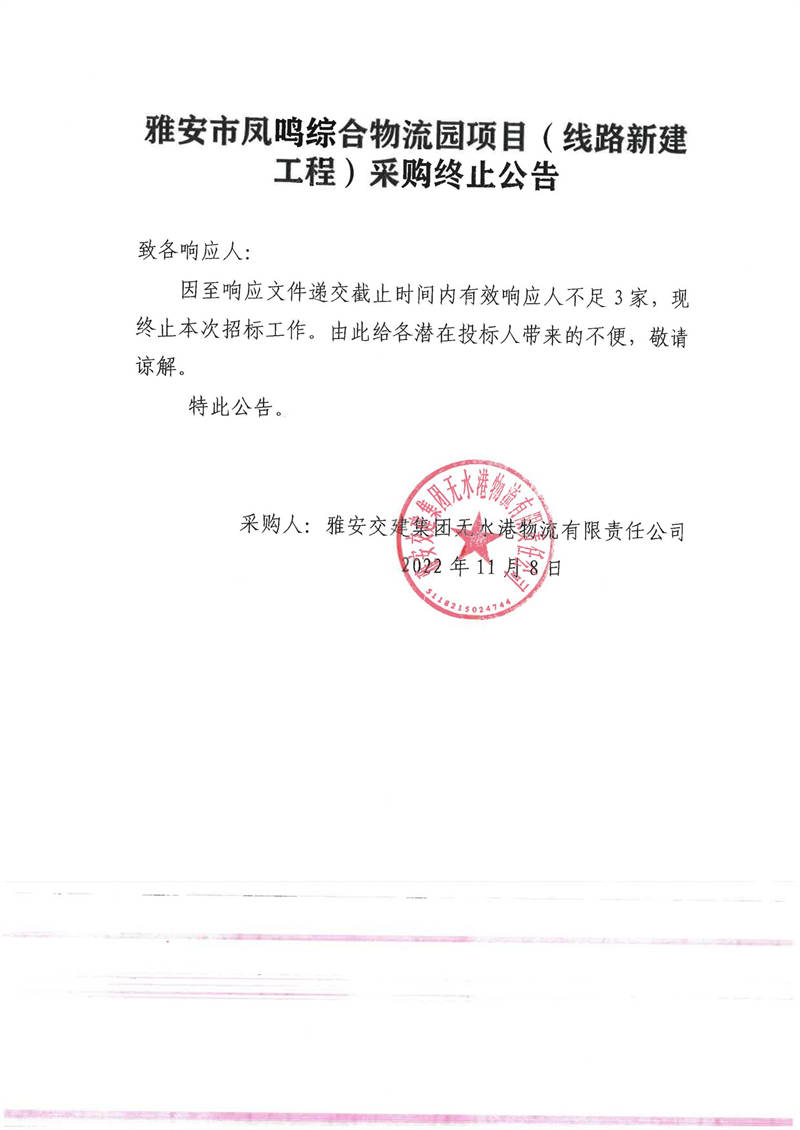 雅安交建集團(tuán)無水港物流有限責(zé)任公司雅安市鳳鳴綜合物流園項(xiàng)目(線路新建工程)采購終止公告