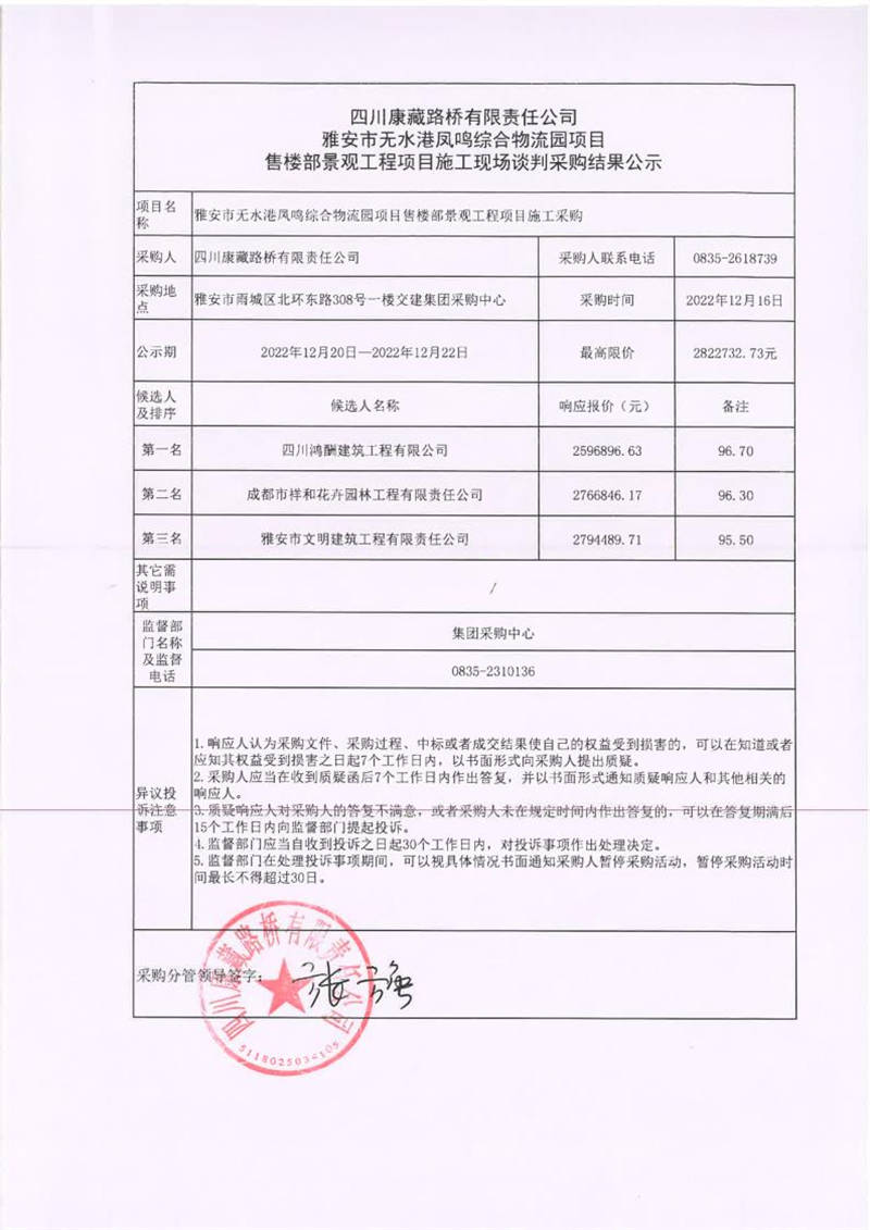 四川康藏路橋有限責任公司雅安市無水港鳳鳴綜合物流園項目售樓部景觀工程施工現(xiàn)場談判采購結(jié)果公示