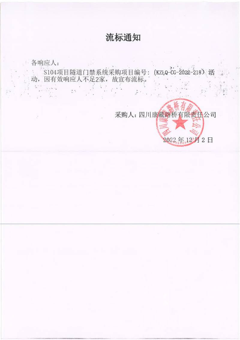 四川康藏路橋有限責(zé)任公司S104項(xiàng)目隧道門禁系統(tǒng)流標(biāo)通知