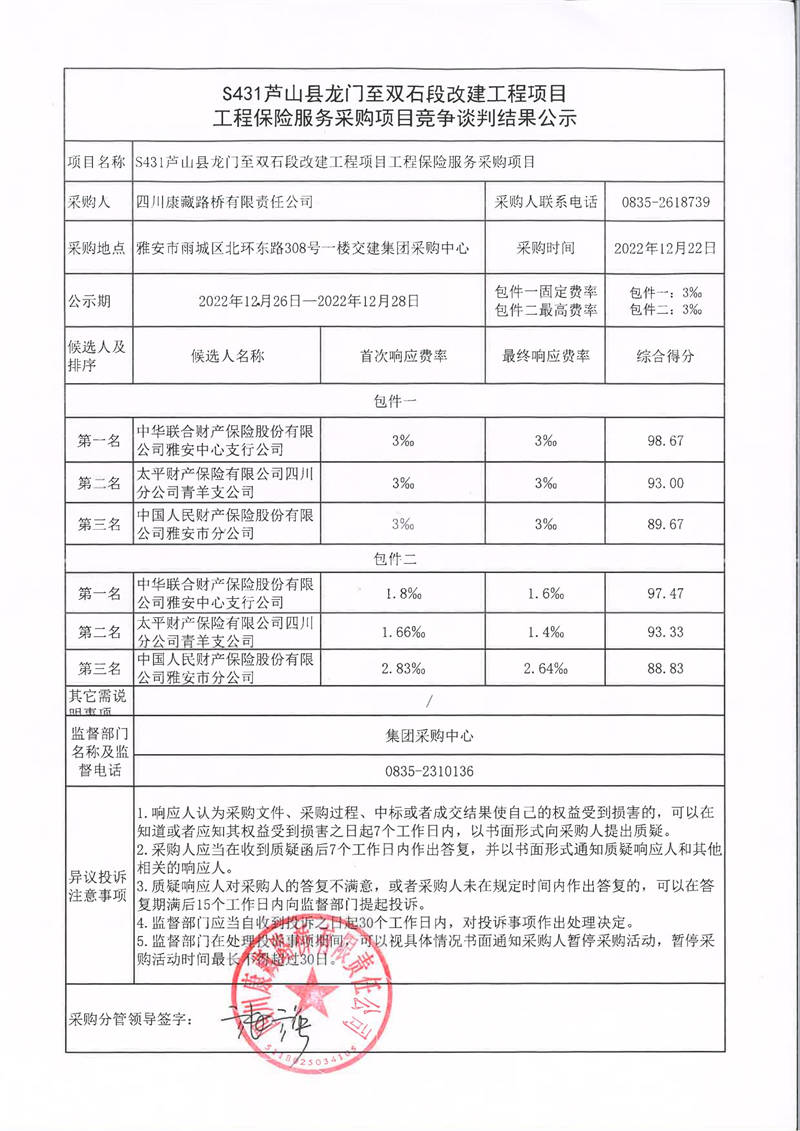 四川康藏路橋有限責任公司S431蘆山縣龍門至雙石段改建工程項目工程保險服務采購項目競爭談判結(jié)果公示