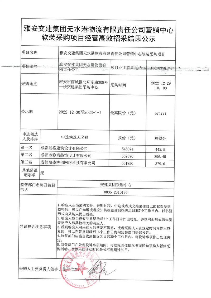 雅安交建集團(tuán)無水港物流有限責(zé)任公司營(yíng)銷中心軟裝采購項(xiàng)目經(jīng)營(yíng)高效招采結(jié)果公示