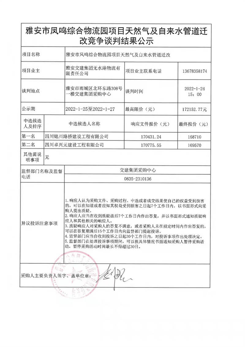 雅安交建集團(tuán)無水港物流有限責(zé)任公司雅發(fā)市鳳鳴綜合物流園項(xiàng)目天然氣及自來水管道遷改競爭談判結(jié)果公示