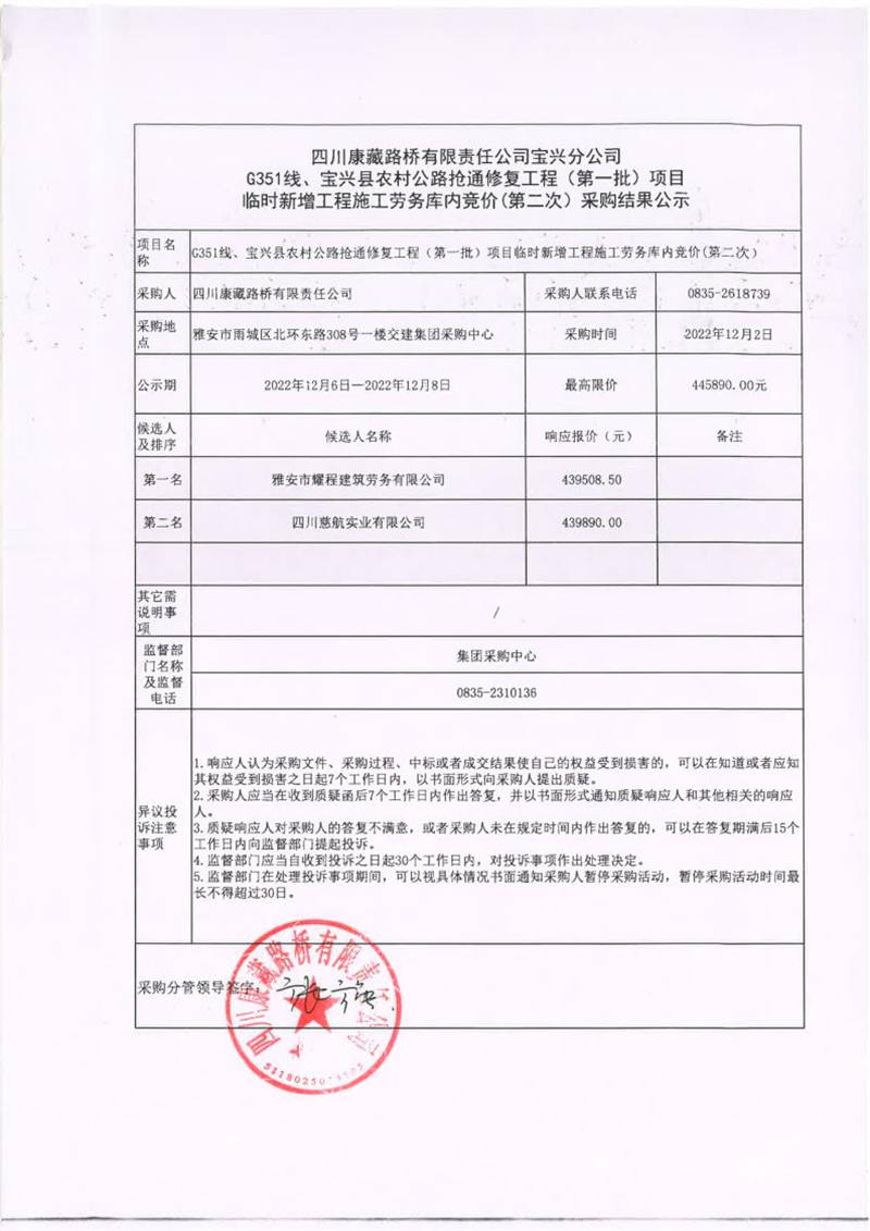 四川康藏路橋有限責任公司寶興分公司G351線、寶興縣農(nóng)村公路搶通修復工程(第一批)項目臨時新增工程施工勞務庫內(nèi)競價(第二次)采購結(jié)果公示