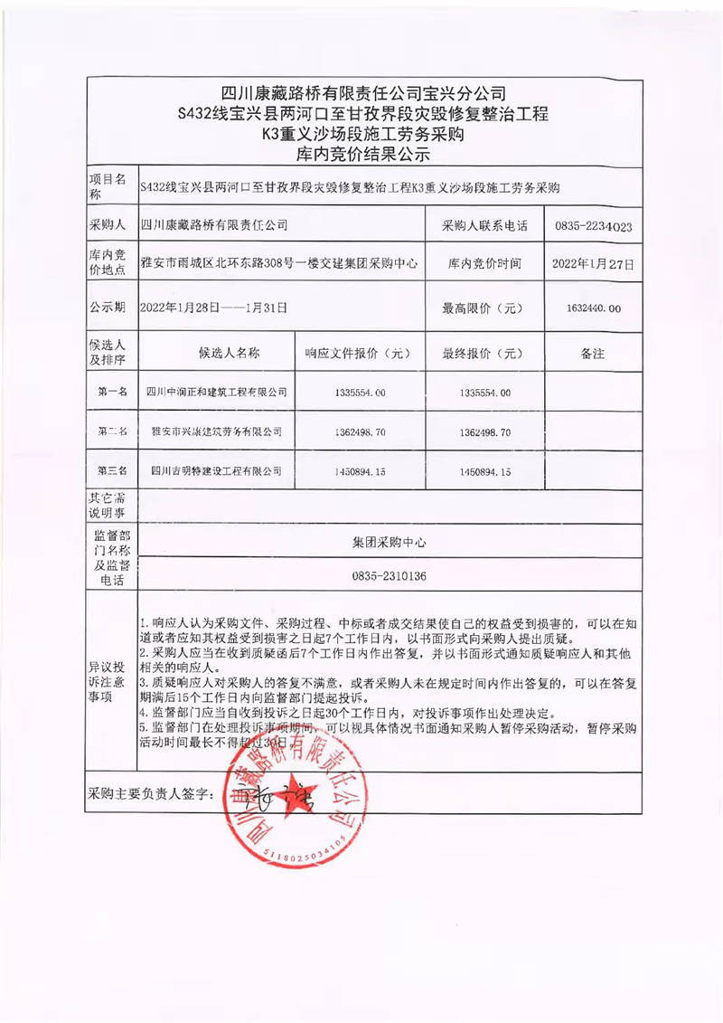 四川康藏路橋有限責(zé)任公司寶興分公司S432線寶興縣兩河口至甘孜界段災(zāi)毀修復(fù)整治工程K3重義沙場段施工勞務(wù)采購庫內(nèi)競價(jià)結(jié)果公示