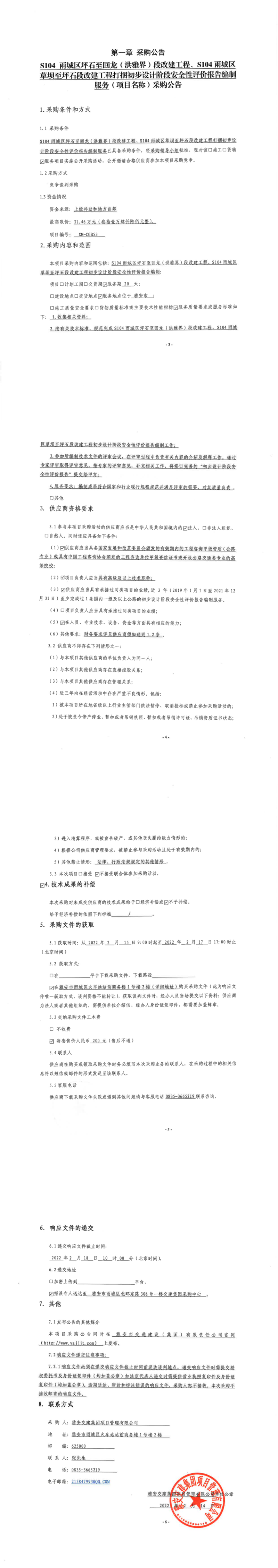 雅安交建集團項目管理有限公司S104雨城區(qū)坪石至回龍(洪雅界)段改建工程、S104雨城區(qū)草壩至坪石段改建工程打捆初步設計階段安全性評價報告編制服務采購公告