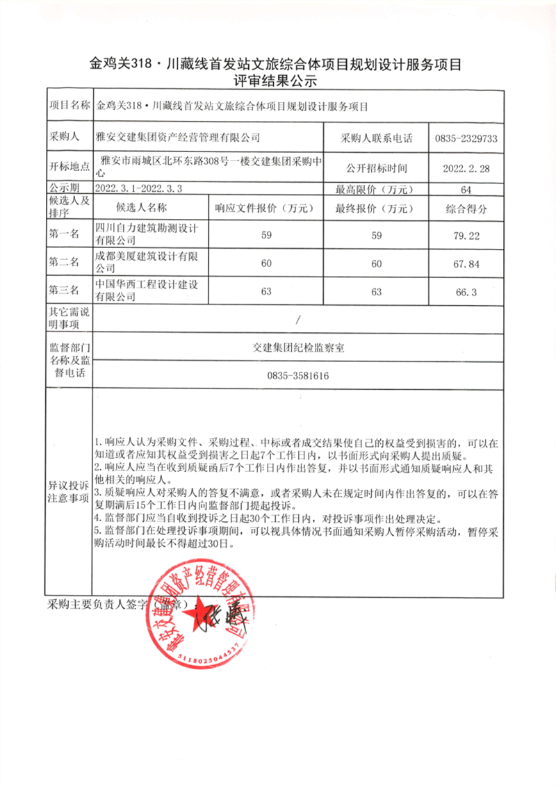 雅安交建集團(tuán)資產(chǎn)經(jīng)營管理有限公司金雞關(guān)318.川藏線首發(fā)站文旅綜合體項目規(guī)劃設(shè)計服務(wù)項目評審結(jié)果公示