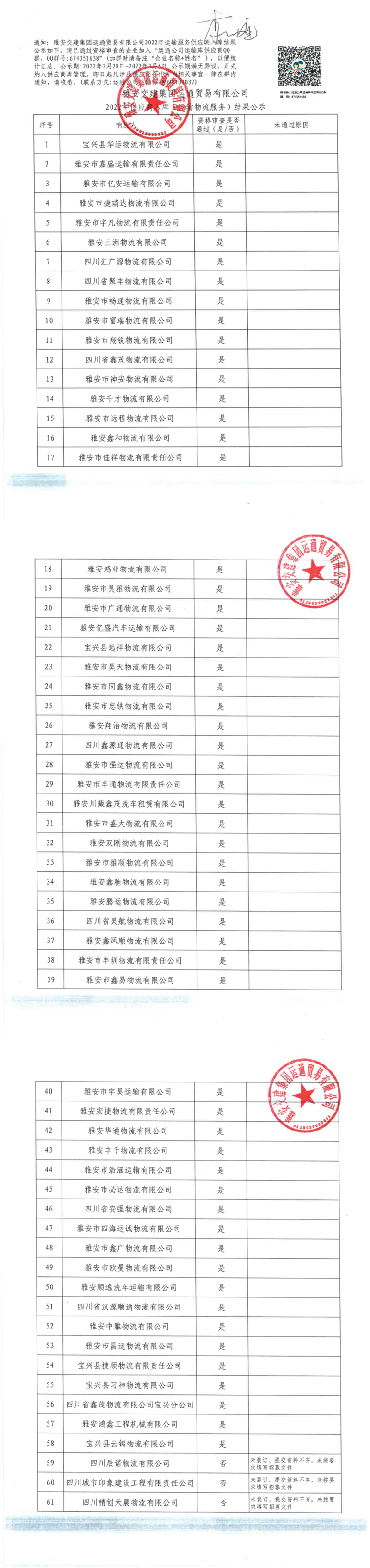 雅安交建集團(tuán)運(yùn)通貿(mào)易有限公司2022年供應(yīng)商入庫(kù)(運(yùn)輸物流服務(wù))結(jié)果公示