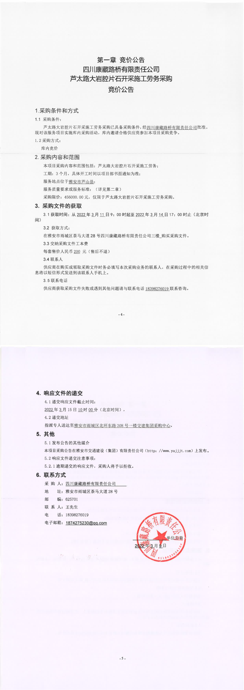 四川康藏路橋有限責任公司蘆太路大巖腔片石開采施工勞務(wù)采購競價公告