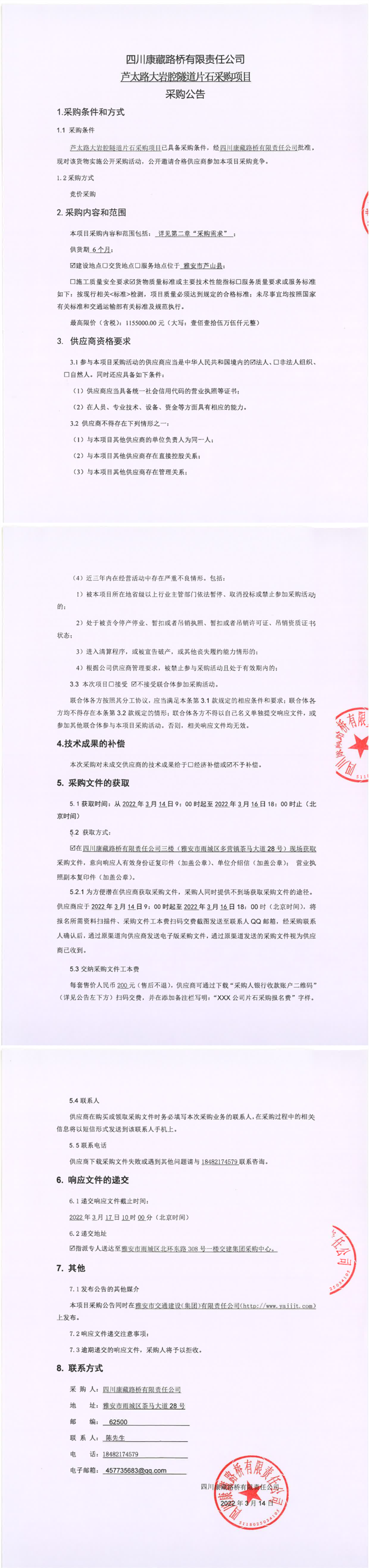 四川康藏路橋有限責任公司蘆太路大巖腔隧道片石采購項目采購公告