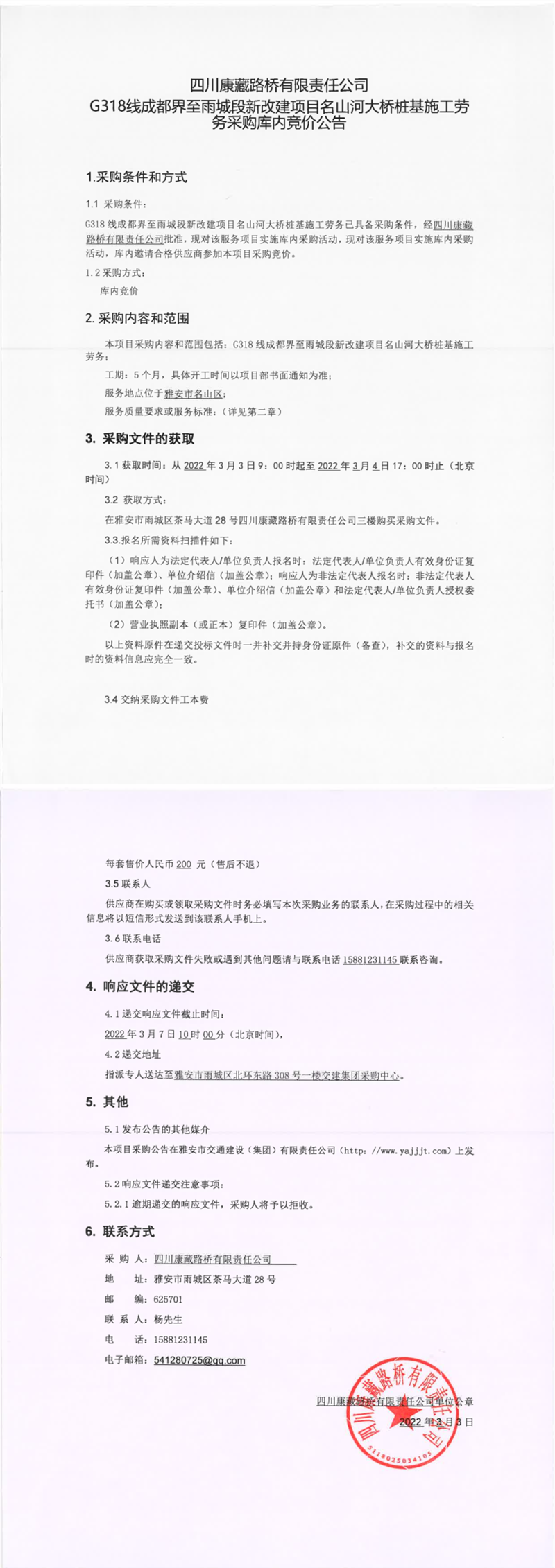 四川康藏路橋有限責任公司G318線成都界至雨城段新改建項目名山河大橋樁基施工勞務(wù)采購庫內(nèi)競價公告