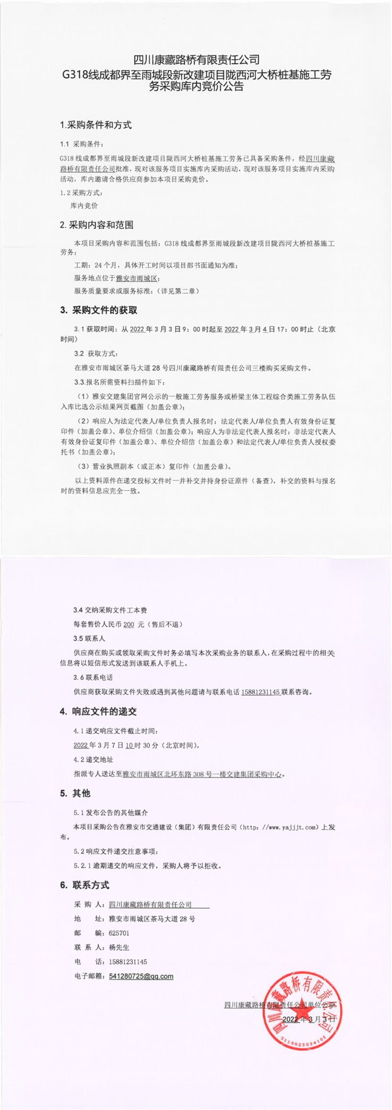 四川康藏路橋有限責任公司G318線成都界至雨城段新改建項目名山河大橋樁基施工勞務(wù)采購庫內(nèi)競價公告