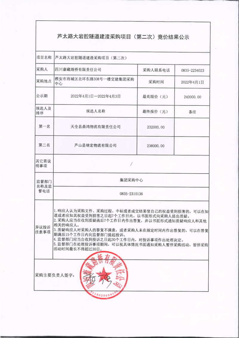 四川康藏路橋有限責(zé)任公司蘆太路大巖腔隧道建渣采購項目(第二次)競價結(jié)果公示