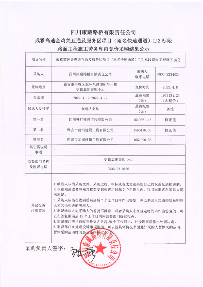 四川康藏路橋有限責(zé)任公司成雅高速金雞關(guān)互通及服務(wù)區(qū)項目(雨名快速通道)TJ2標(biāo)段路面工程施工勞務(wù)庫內(nèi)競價采購結(jié)果公示