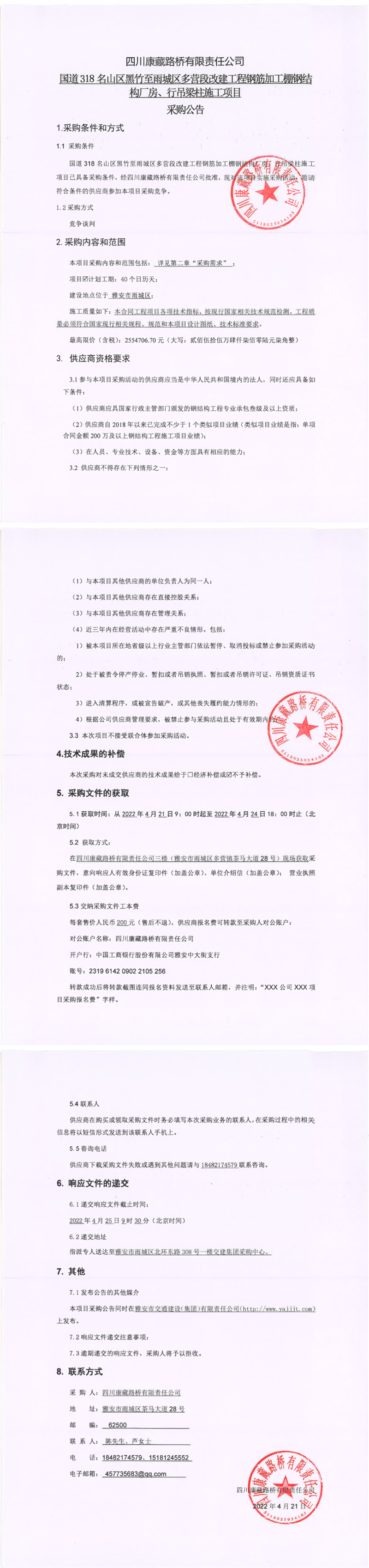 四川康藏路橋有限責任公司國道318名山區(qū)黑竹至雨城區(qū)多營段改建工程鋼筋加工棚鋼結構廠房、行吊梁柱施工項目采購公告