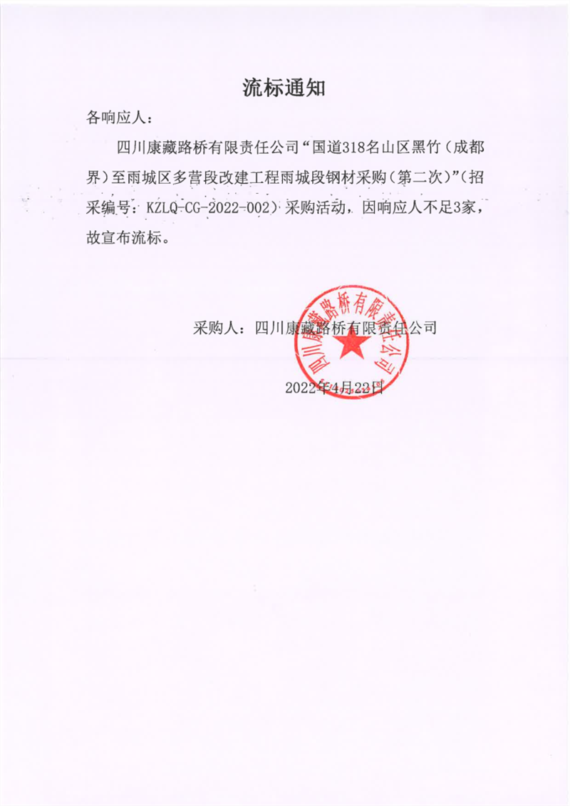 四川康藏路橋有限責任公司國道318名山區(qū)黑竹(成都界)至雨城區(qū)多營段改建工程雨城段鋼材采購(第二次)流標通知