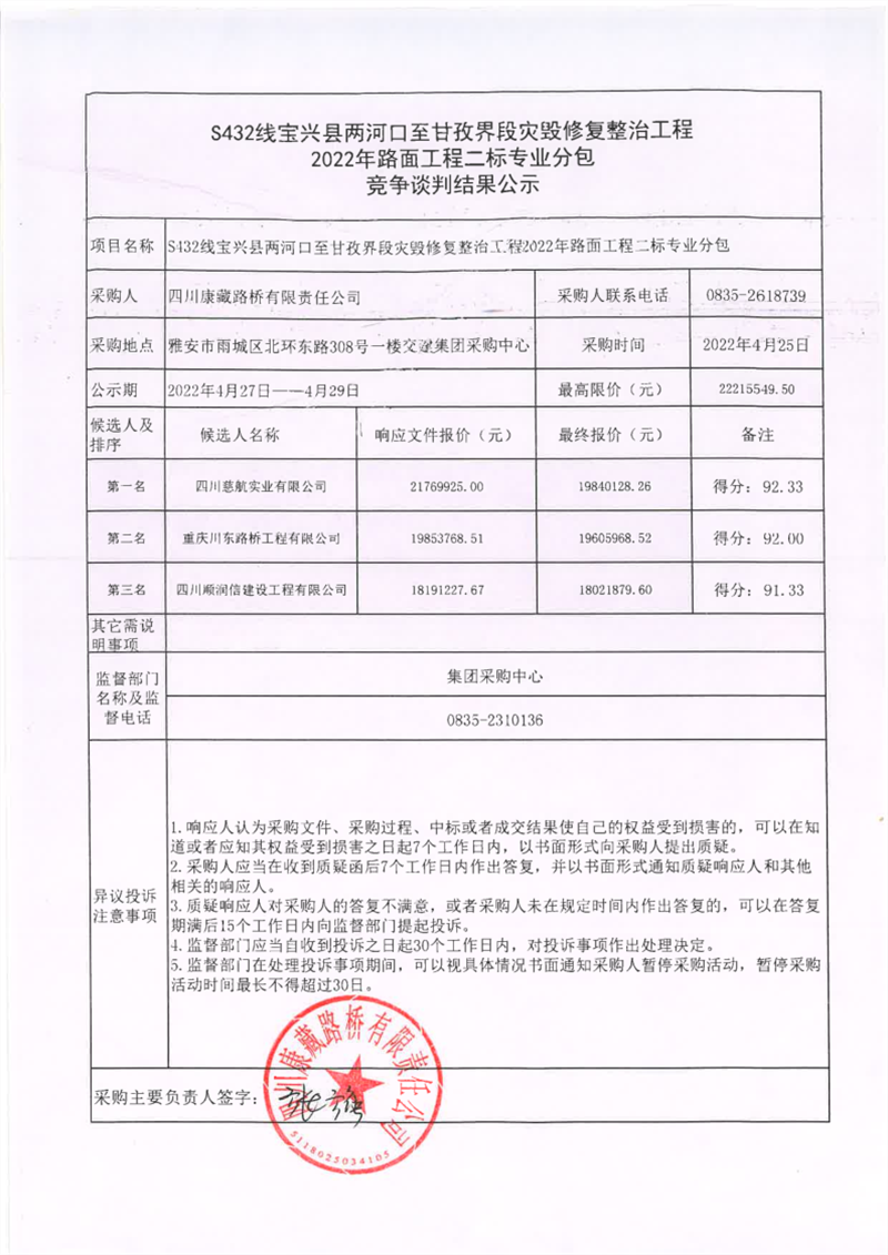 四川康藏路橋有限責任公司S432線寶興縣兩河口至甘孜界段災(zāi)毀修復整治工程2022年路面工程二標專業(yè)分包競爭談判結(jié)果公示