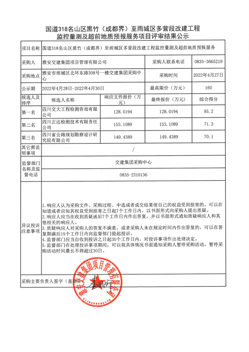 雅安交建集團項目管理有限公司國道318名山區(qū)黑竹(成都界)至雨城區(qū)多營段改建工程監(jiān)控量測及超前地質(zhì)預報服務項目評審結果公示