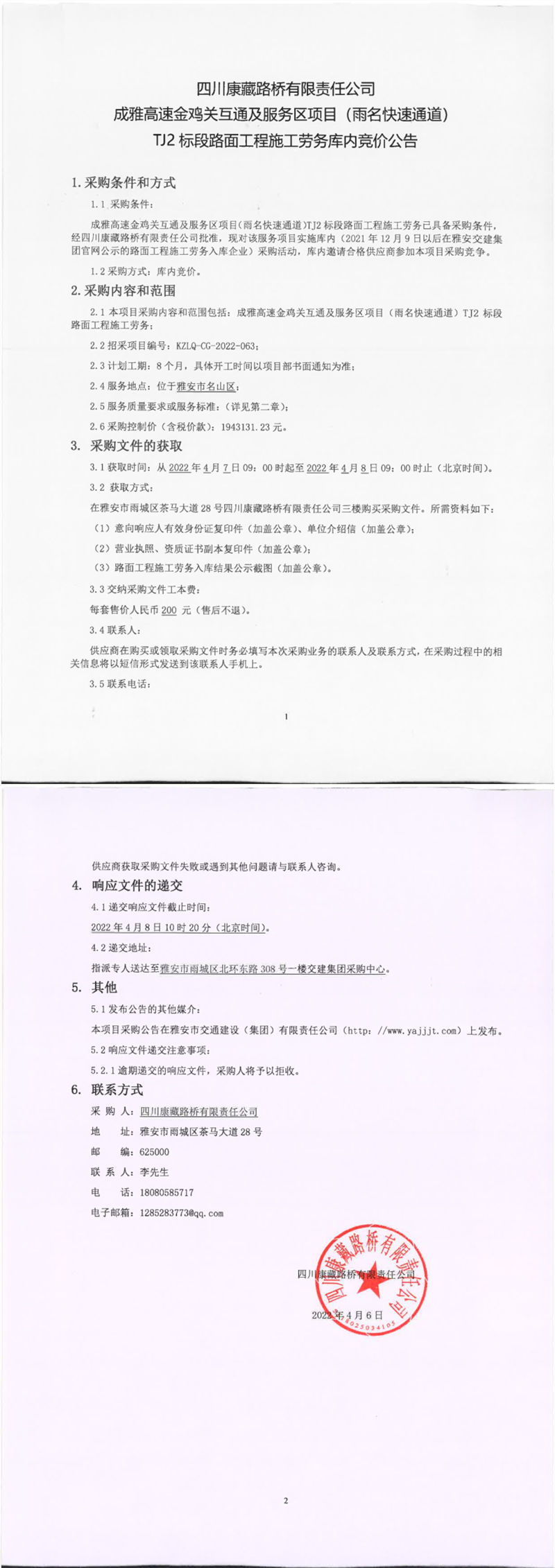四川康藏路橋有限責任公司成雅高速金雞關互通及服務區(qū)項目(雨名快速通道)TJ2標段路面工程施工勞務庫內競價公告