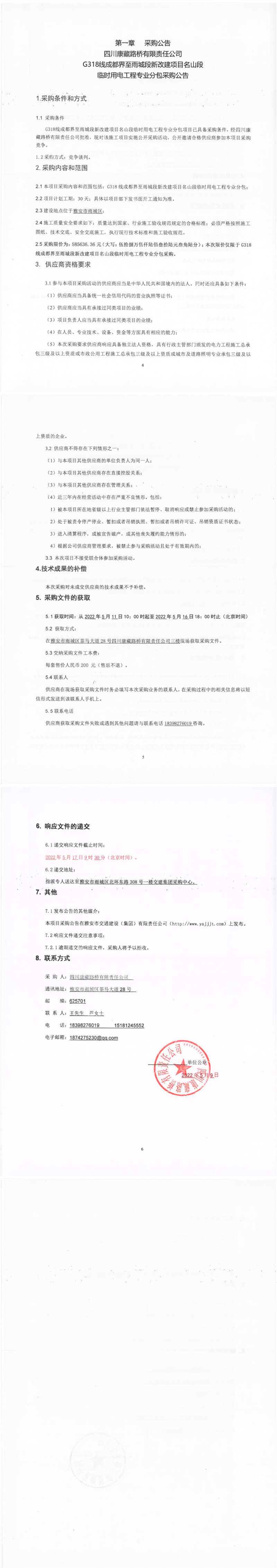 四川康藏路橋有限責任公司G318線成都界至雨城段新改建項目名山段臨時用電工程專業(yè)分包采購公告