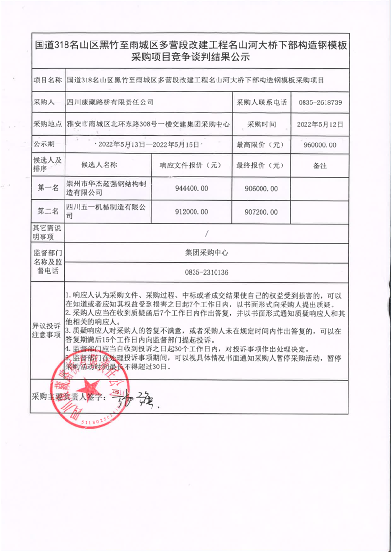 四川康藏路橋有限責任公司國道318名山區(qū)黑竹至雨城區(qū)多營段改建工程名山河大橋下部構造鋼模板采購項目競爭談判結果公示