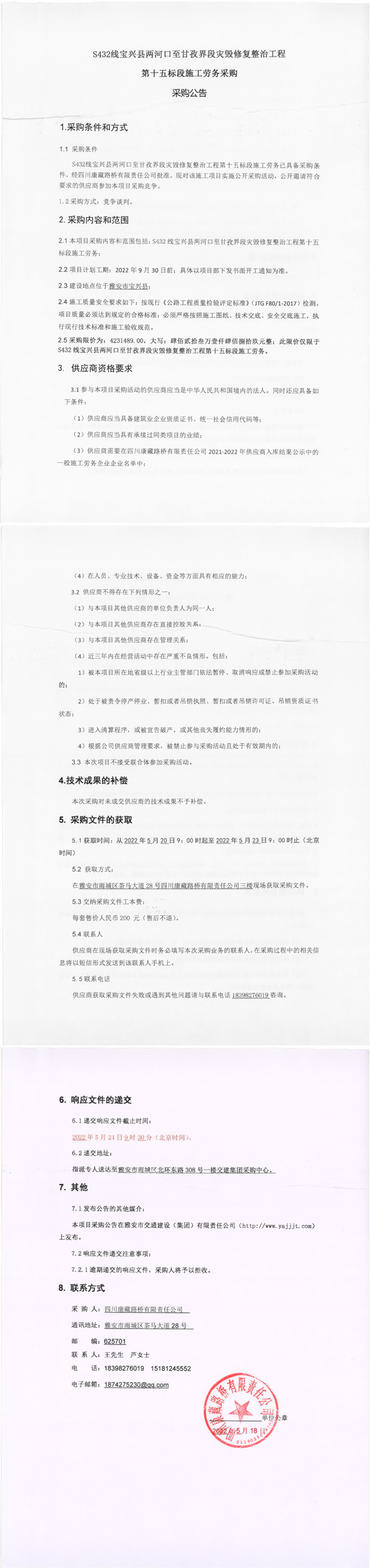 四川康藏路橋有限責(zé)任公司S432線寶興縣兩河口至甘孜界段災(zāi)毀修復(fù)整治工程第十五標(biāo)段施工勞務(wù)采購采購公告