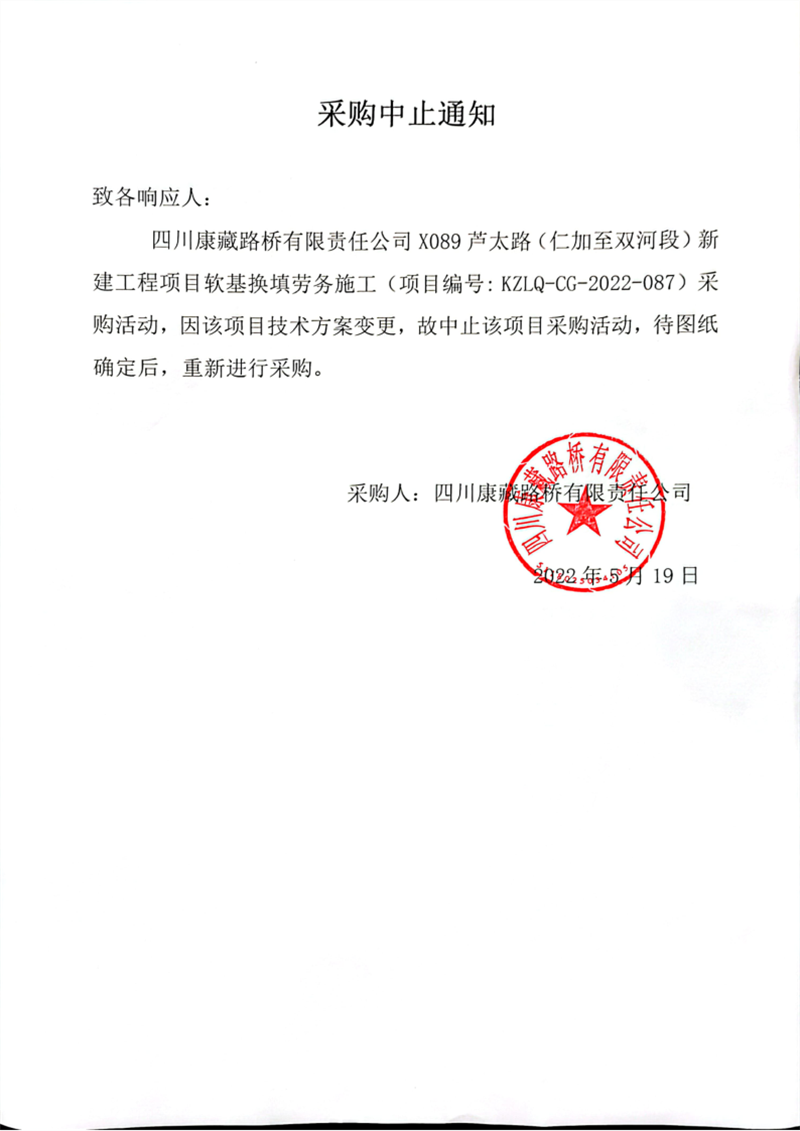 四川康藏路橋有限責任公司X089蘆太路(仁加至雙河段)新建工程項目軟基換填勞務(wù)施工采購中止通知