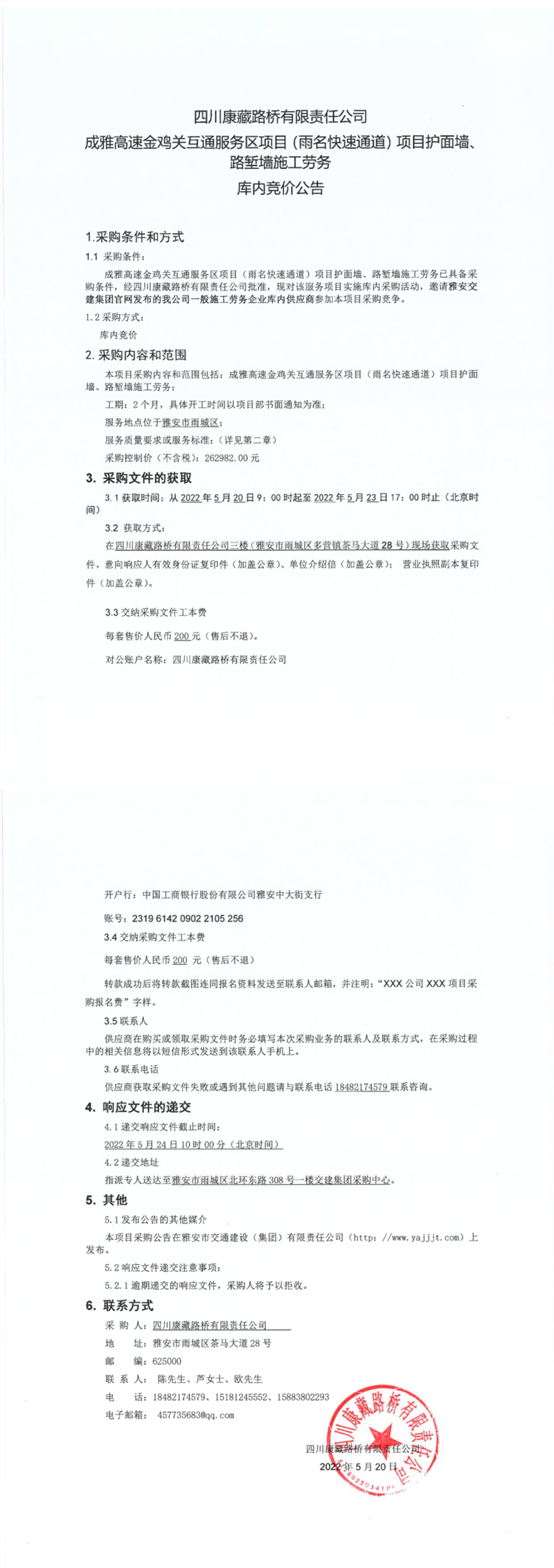四川康藏路橋有限責(zé)任公司成雅高速金雞關(guān)互通服務(wù)區(qū)項(xiàng)目(雨名快速通道)項(xiàng)目護(hù)面墻、路塹墻施工勞務(wù)庫(kù)內(nèi)競(jìng)價(jià)公告