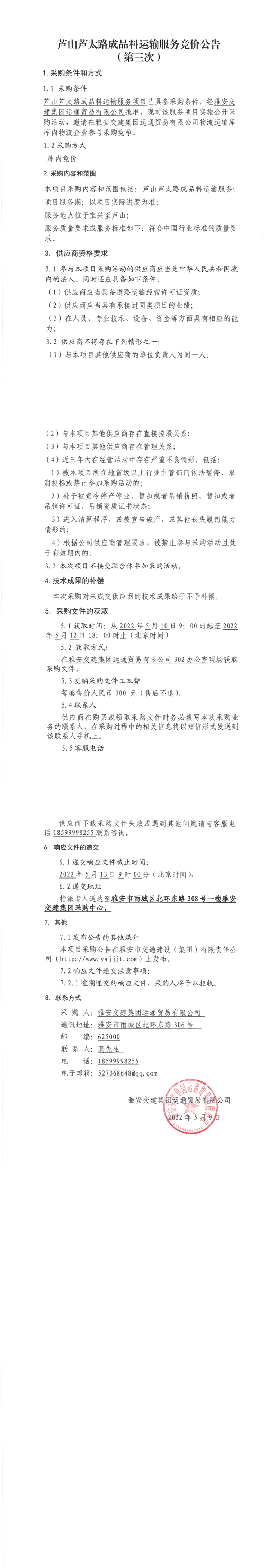 雅安交建集團(tuán)運(yùn)通貿(mào)易有限公司蘆山蘆太路成品料運(yùn)輸服務(wù)競(jìng)價(jià)公告(第三次)