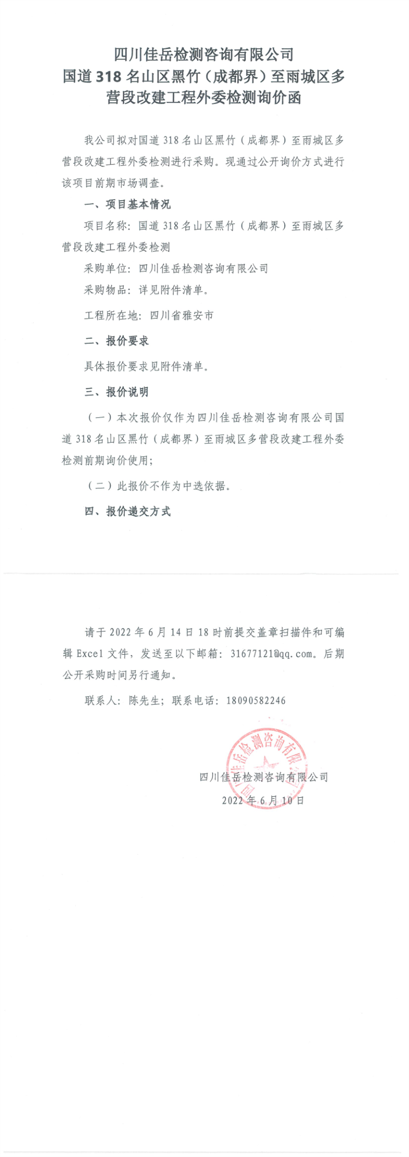 四川佳岳檢測(cè)咨詢有限公司國(guó)道318名山區(qū)黑竹(成都界)至雨城區(qū)多營(yíng)段改建工程外委檢測(cè)詢價(jià)函