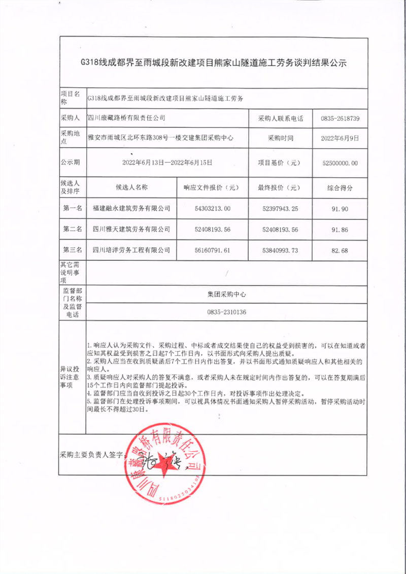 四川康藏路橋有限責(zé)任公司G318線成都界至雨城段新改建項目熊家山隧道施工勞務(wù)談判結(jié)果公示