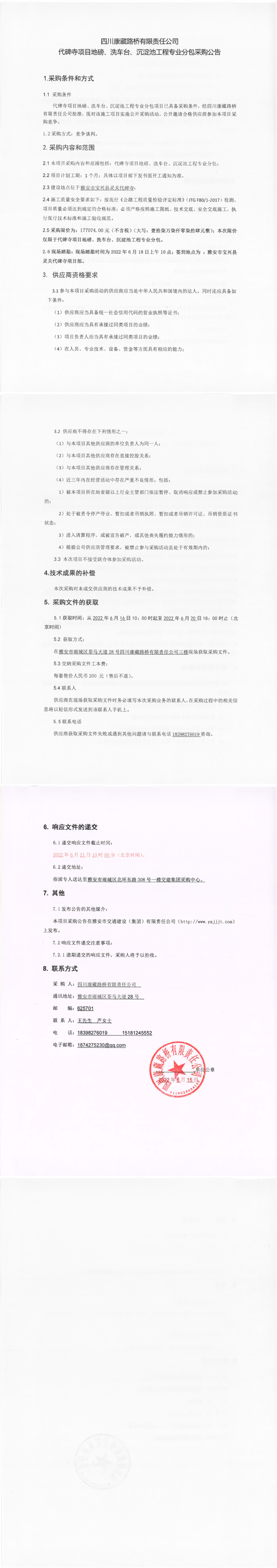 四川康藏路橋有限責(zé)任公司代碑寺項目地磅、洗車臺、沉淀池工程專業(yè)分包采購公告
