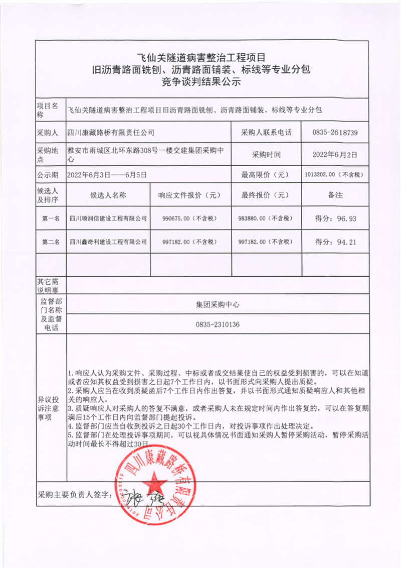 四川康藏路橋有限責任公司飛仙關隧道病害整治工程項目舊瀝青路面銑刨、瀝青路面鋪裝、標線等專業(yè)分包競爭談判結(jié)果公示