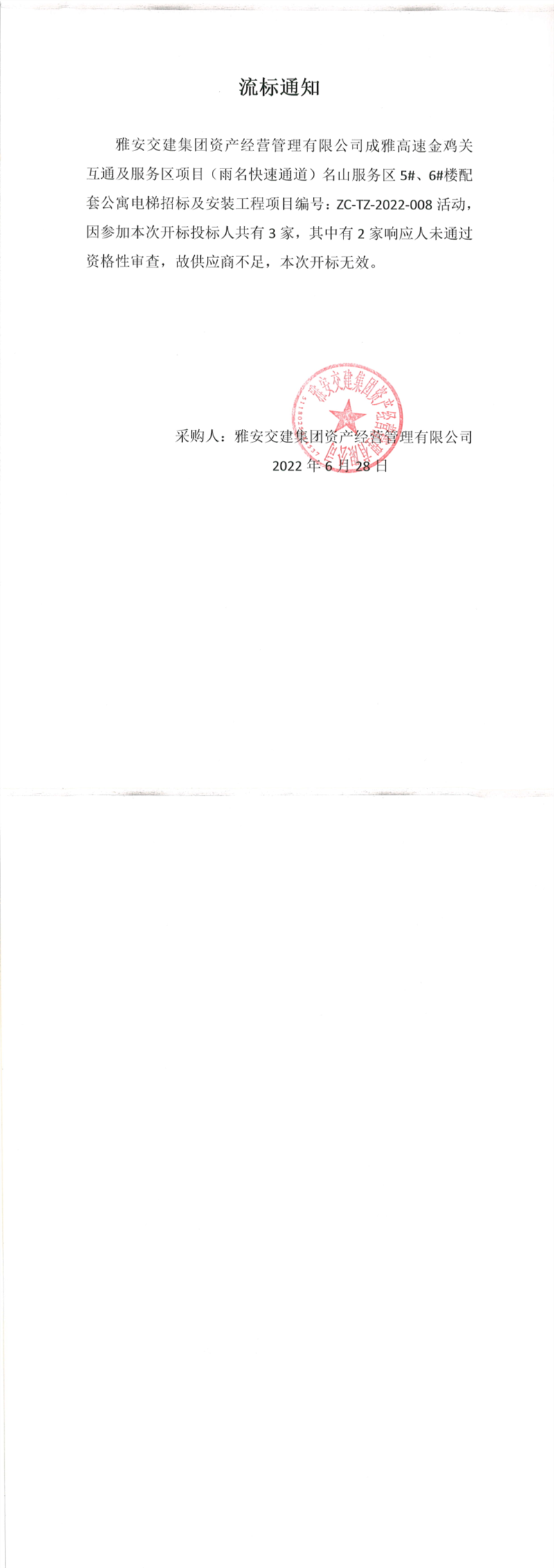雅安交建集團(tuán)資產(chǎn)經(jīng)營(yíng)管理有限公司成雅高速金雞關(guān)互通及服務(wù)區(qū)(雨名快速通道)名山服務(wù)區(qū)5#、6#樓配套公寓電梯招標(biāo)及安裝工程項(xiàng)目流標(biāo)通知
