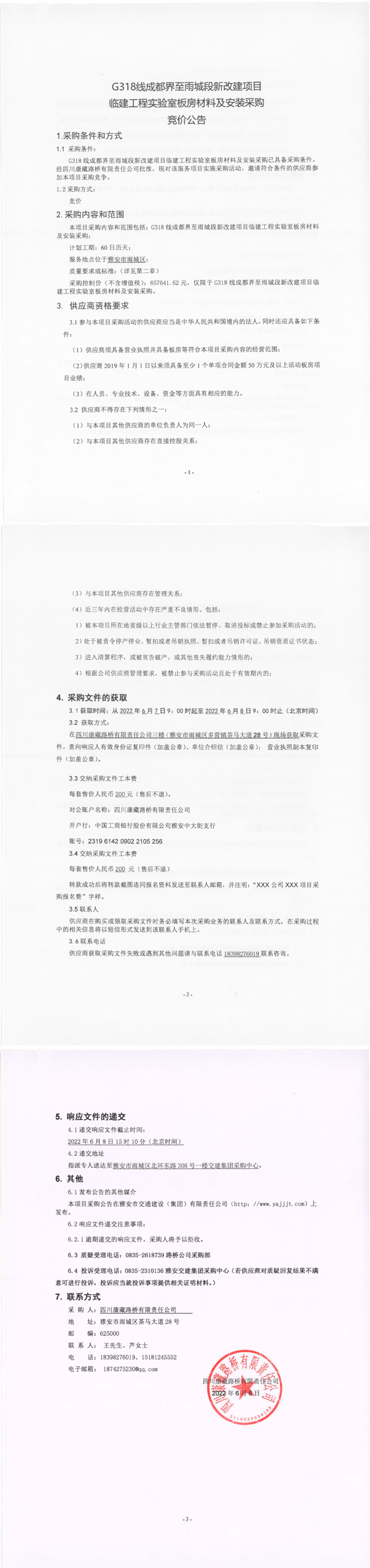四川康藏路橋有限責(zé)任公司G318線成都界至雨城段新改建項(xiàng)目臨建工程實(shí)驗(yàn)室板房材料及安裝采購競價公告