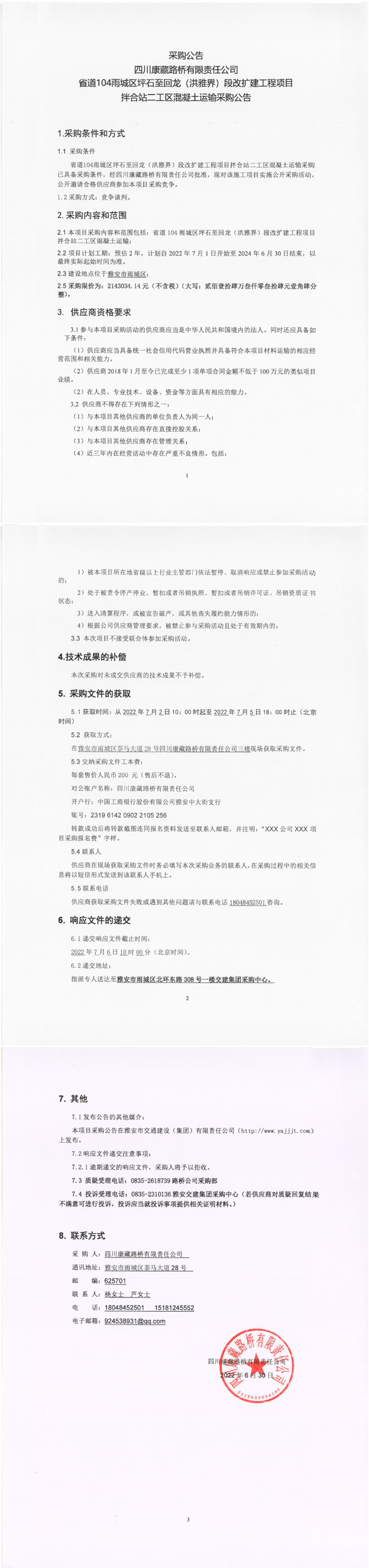四川康藏路橋有限責(zé)任公司省道104雨城區(qū)坪石至回龍(洪雅界)段改擴建工程項目拌合站二工區(qū)混凝土運輸采購公告