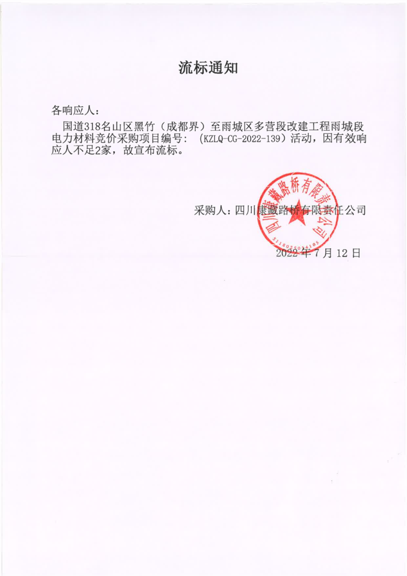 四川康藏路橋有限責(zé)任公司國道318名山區(qū)黑竹(成都界)至雨城區(qū)多營段改建工程雨城段電力材料競價(jià)采購項(xiàng)目流標(biāo)通知