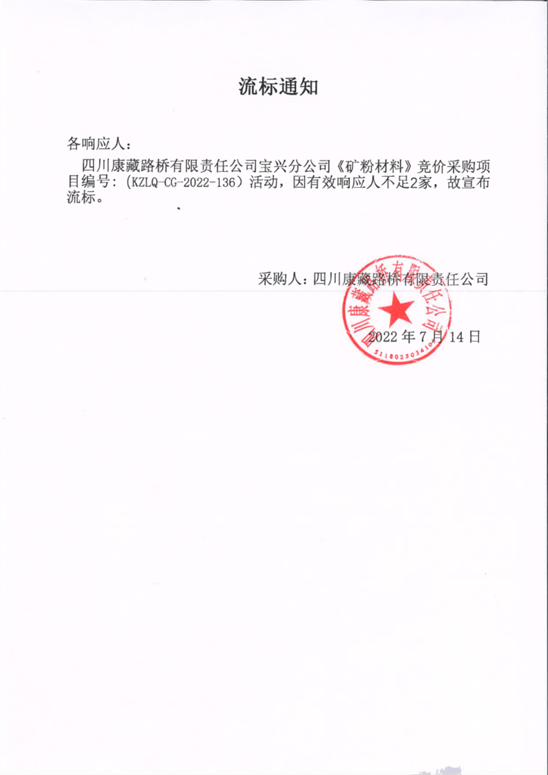 四川康藏路橋有限責(zé)任公司寶興分公司礦粉材料采購(gòu)流標(biāo)通知
