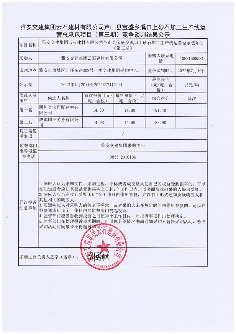 雅安交建集團云石建材有限公司蘆山縣寶盛鄉(xiāng)溪口上砂石加工生產(chǎn)線運營總承包項目(第三期)競爭談判結(jié)果公示