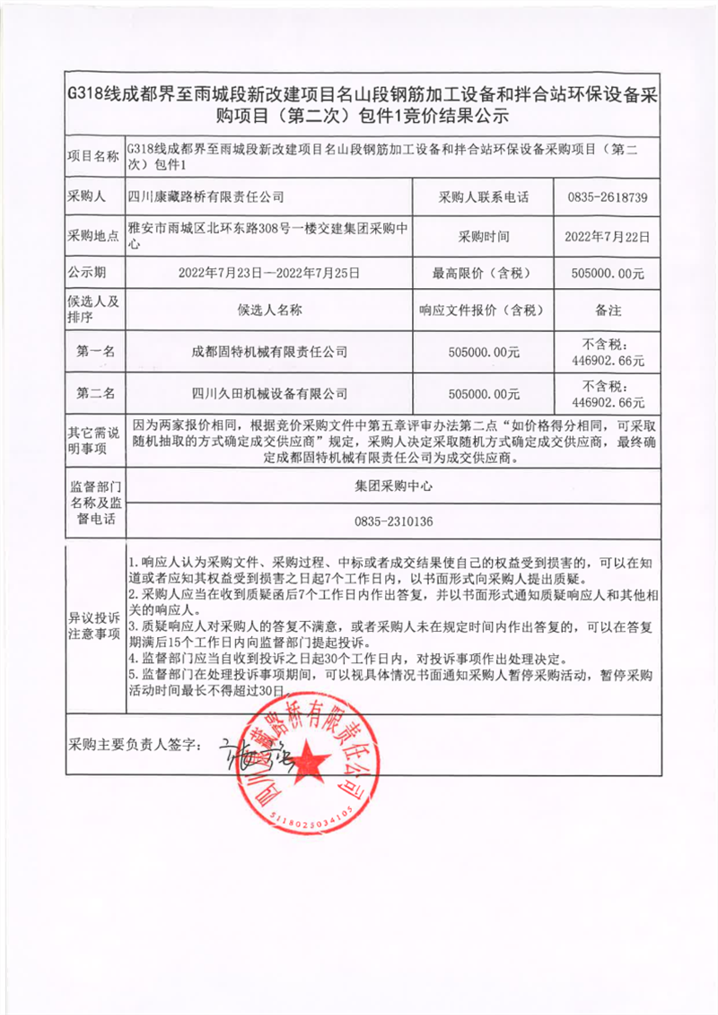 四川康藏路橋有限責(zé)任公司G318線成都界至雨城段新改建項(xiàng)目名山段鋼筋加工設(shè)備和拌合站環(huán)保設(shè)備采購項(xiàng)目(第二次)包件1競(jìng)價(jià)結(jié)果公示