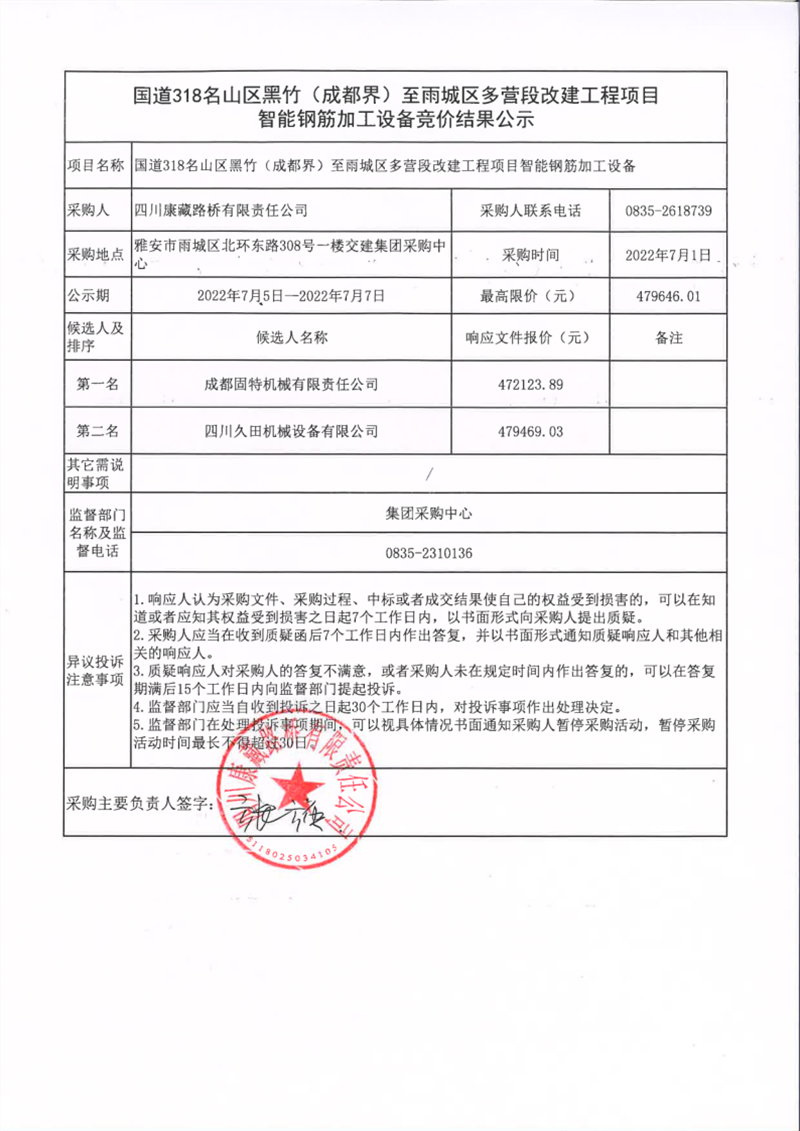 四川康藏路橋有限責(zé)任公司國道318名山區(qū)黑竹(成都界)至雨城區(qū)多營段改建工程智能鋼筋加工設(shè)備競價(jià)結(jié)果公示