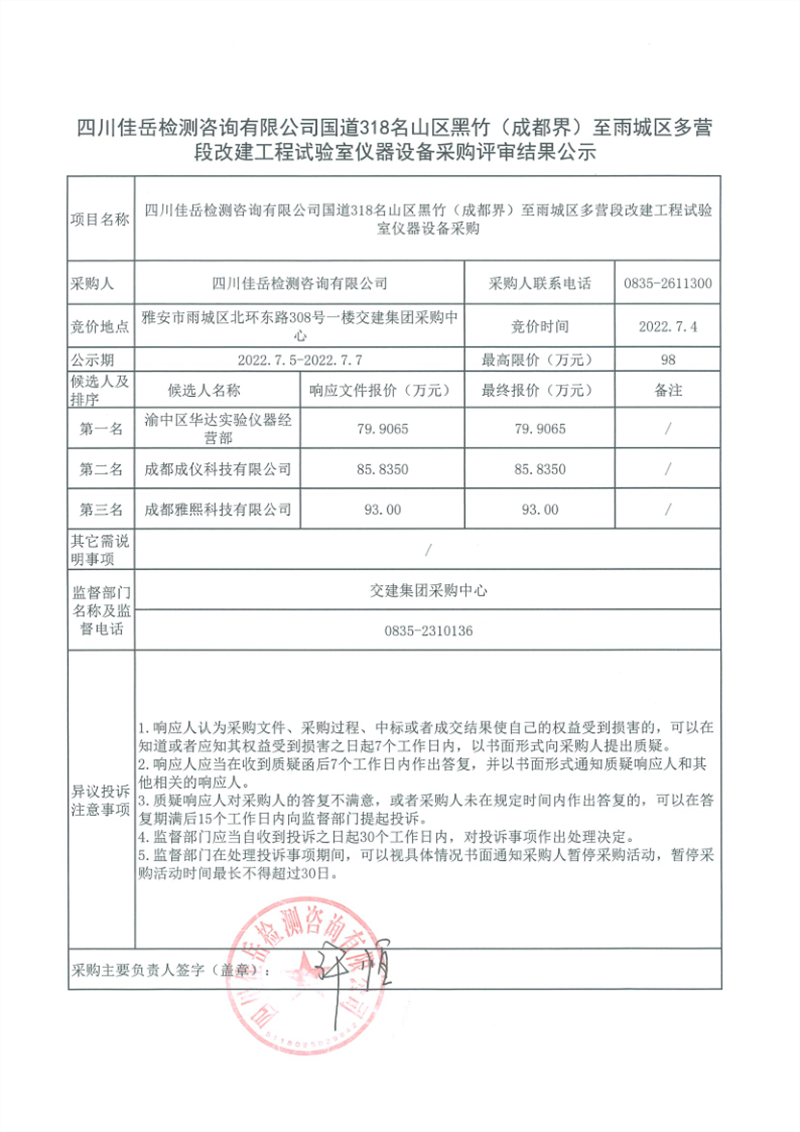 四川佳岳檢測(cè)咨詢(xún)有限公司國(guó)道318名山區(qū)黑竹(成都界)至雨城區(qū)多營(yíng)段改建工程試驗(yàn)室儀器設(shè)備采購(gòu)評(píng)審結(jié)果公示