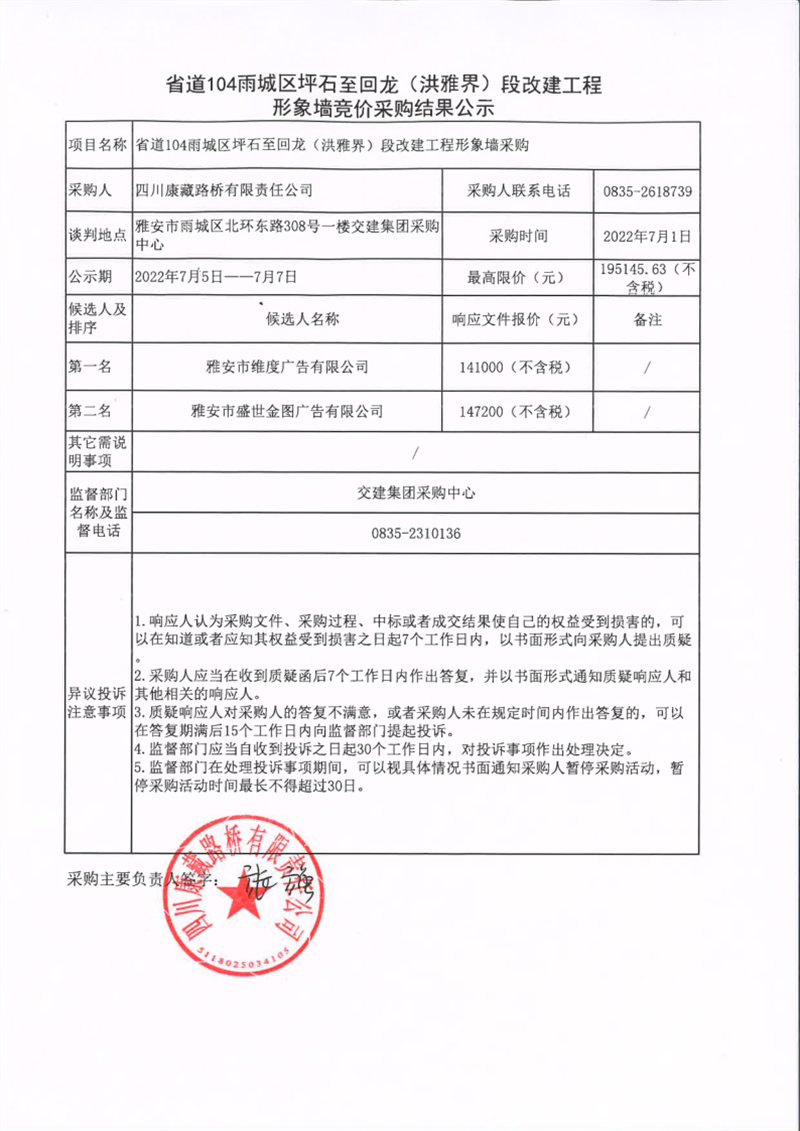 四川康藏路橋有限責(zé)任公司省道104雨城區(qū)坪石至回龍(洪雅界)段改建工程形象墻競價采購結(jié)果公示