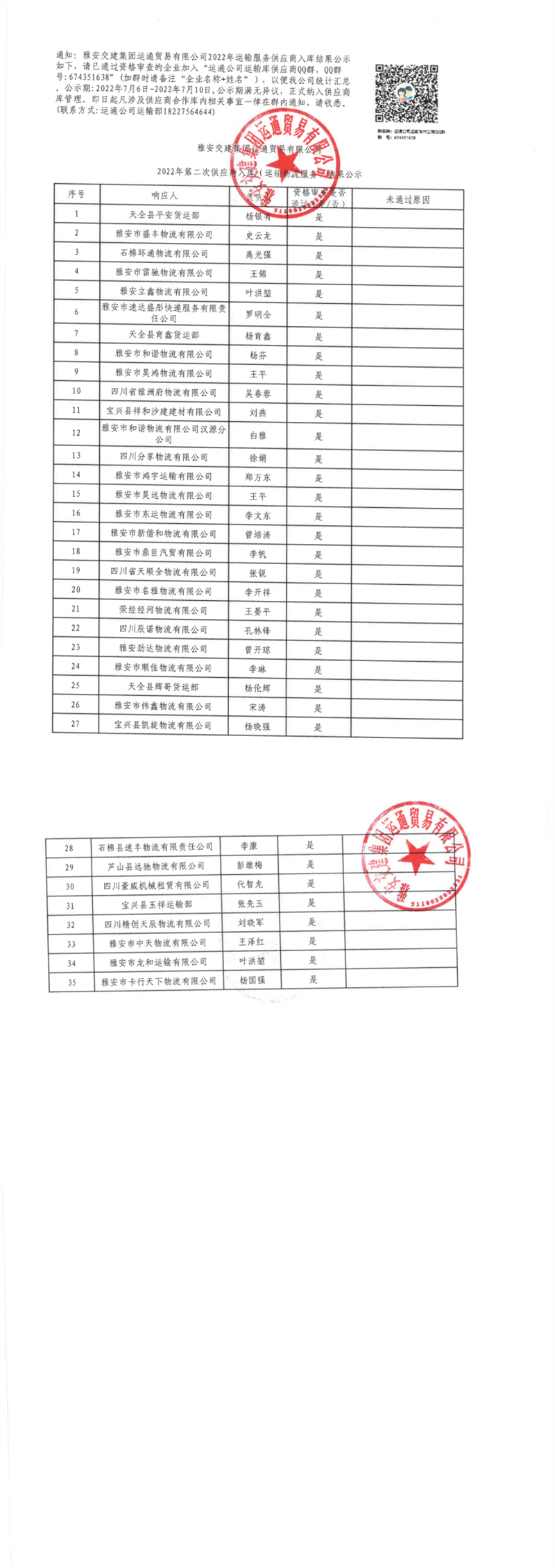 雅安交建集團運通貿易有限公司2022年第二次供應商入庫(運輸物流服務)結果公示