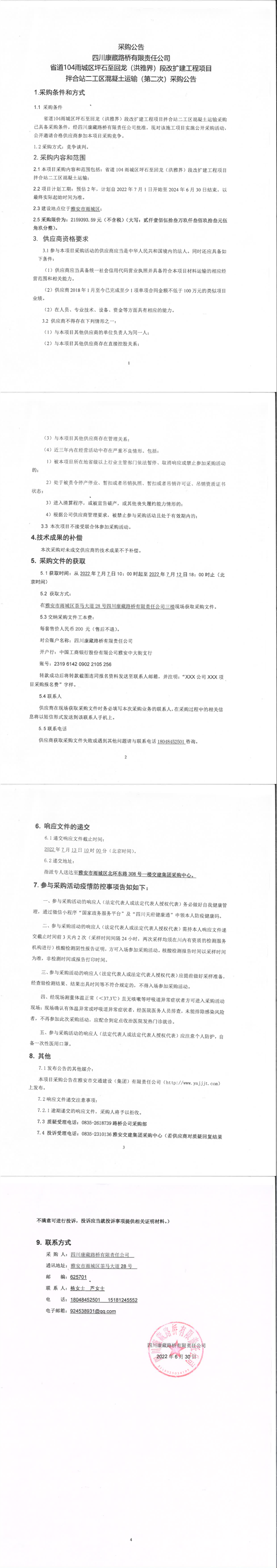 四川康藏路橋有限責(zé)任公司省道104雨城區(qū)坪石至回龍(洪雅界)段改建工程項(xiàng)目拌合站二工區(qū)混凝土運(yùn)輸(第二次)采購(gòu)公告