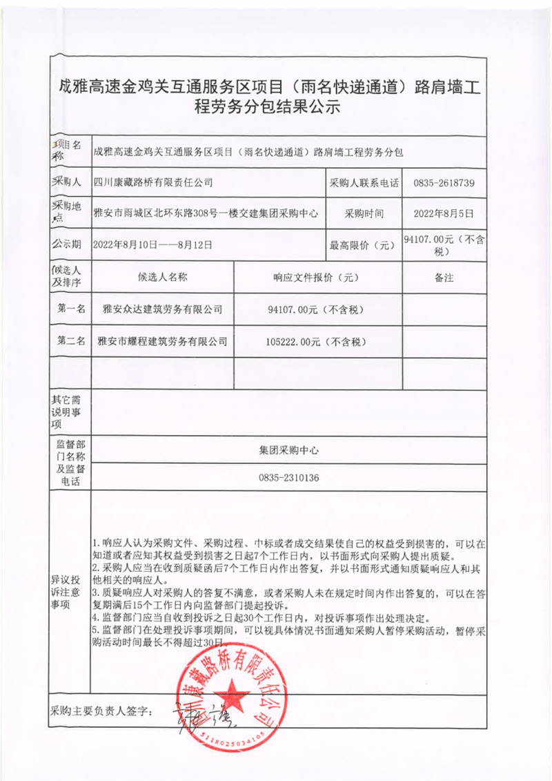 四川康藏路橋有限責任公司成雅高速金雞關(guān)互通服務(wù)區(qū)項目(雨名快速通道)路肩墻工程勞務(wù)分包結(jié)果公示